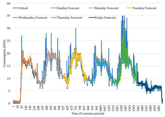 The scheduled forecasts and the retraining process are illustrated in Figure 1 and are further explained in Section 3.3 and Section 3.4. The forecasts are scheduled to run for all five minutes instances of the weekdays concerning Monday to Saturday. The error metrics are calculated for each one of the five-minute period, giving a total of 288 periods per day, and thus, 1728 periods for the six days of the week. The retrain process is triggered in order to decrease the forecasting error. This is a decision taken every day of the week at midnight triggered for the set of weekdays: Tuesday, Wednesday, Thursday, Friday, and Saturday. Additionally, the calculated forecast on each day of the week from Sunday to Friday represents the forecasts made for the respective day and with updated information from that day for the remaining week. Thus, the Sunday forecast will predict from Monday to Saturday, while the Monday forecast will update the Monday information, hence predicting from Tuesday to Saturday. The final forecast errors for each train are calculated, as can be seen in Table 2. Moreover, the forecast of each five minutes period is illustrated in Figure 7, and the forecast errors of each five-minute period are illustrated in Figure 8. A detailed explanation of the information in Table 2 is as follows: