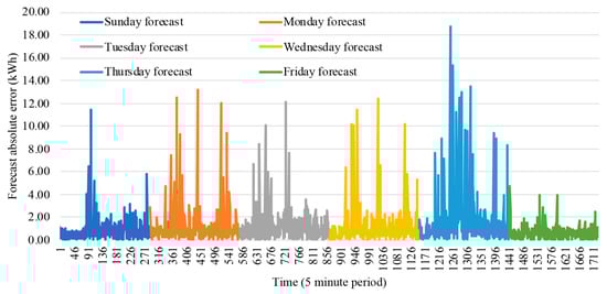 The Sunday forecast initially provides low errors for many sequential periods, until it reaches a sequence of five-minute periods usually in an error difference range between 2 and 6 (10 to 30%) followed by a sequential period that tends to stay in an error difference near a value 2, about 10%. The Monday forecast features frequent five-minutes periods with low absolute errors with ranges between 0 and 1 (0 to 5%); however, on the other hand, it also contains some high forecast errors that reach absolute differences between 2 and 12 (10 to 60%). The Tuesday forecasts are featured by many sequential five-minute period absolute errors in a range between 0 and 2, or, in other words, 0 to 10%. The Wednesday forecast features initial absolute differences between 0 and 1 followed by absolute differences between 0 and 2, meaning that an initial tendency to stay in a range between 0 and 10% is followed by a tendency to reach higher errors more precisely between 0 and 20%.