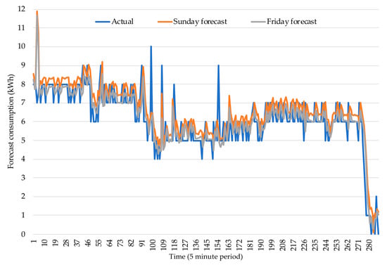 With more detail, for the forecast made on Friday (regarding the consumption on Saturday), which is selected as an example for illustration purposes, Figure 9 presents the actual and the forecasted consumption for 13 April 2019. It can be seen that the most updated forecast, with more recent data that is adequately handled by the proposed methodology, achieves a more accurate description of the actual consumption when looking at the single period forecast rather than evaluating the overall average error in a certain time range.