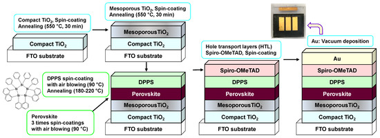 A fabrication process of the present solar cell devices is schematically illustrated in Figure 1. The fabrication conditions were ~27 °C temperature and ~40% humidity in ambient air [52,53]. F-doped tin oxide (FTO, Nippon Sheet Glass Company, Tokyo, Japan, ~10 Ω/□) substrates were cleaned by methanol and acetone in an ultrasonic bath and an ultraviolet ozone cleaner (Asumi Giken, Tokyo, Japan, ASM401N) [26,54]. Next, 0.15 and 0.30 M precursor solutions of TiO2 compact layers were prepared from 1-butanol (Wako Pure Chemical Industries, Osaka, Japan) and titanium diisopropoxide bis(acetylacetonate) (Sigma Aldrich, Tokyo, Japan). These precursor solutions of compact TiO2 were spin-coated on the FTO substrate at 3000 rpm for 30 s, and the substrates were annealed at 125 °C for 5 min. To form a uniform compact TiO2 layer, the 0.30 M precursor solution was spin-coated twice. Then, the FTO substrate was annealed at 550 °C for 30 min to form the compact TiO2 layer. After that, a TiO2 paste (precursor solution for mesoporous TiO2) was spin-coated on the compact TiO2 layer at 5000 rpm for 30 s. This TiO2 paste was prepared by mixing distilled water (0.5 mL), poly(ethylene glycol) PEG-20000 (Nacalai Tesque, Kyoto, Japan, PEG #20000, 20 mg), and TiO2 powder (Aerosil, Tokyo, Japan, P-25, 200 mg). This solution was further mixed with the surfactant Triton X-100 (Sigma Aldrich, 10 μL) and acetylacetone (Wako Pure Chemical Industries, 20 μL) for 30 min, and it was left untouched for 24 h to remove bubbles in the solution [53]. To form the mesoporous TiO2 layer, the TiO2-coated substrates were annealed at 550 °C for 30 min.