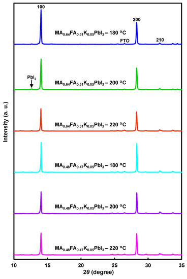 XRD patterns of the perovskite solar cells are shown in Figure 2. In all devices, highly (100)-oriented crystals of the perovskite compounds were observed, which were formed by the hot air-blowing method [27]. All devices presented few peaks corresponding to PbI2, which indicated the effectiveness of the DPPS layer against high-temperature annealing at ~200 °C. Although peaks of lesser intensities, assigned to PbI2, were observed for the MA0.64FA0.31K0.05PbI3 devices, especially when annealed at 200 °C, almost no PbI2 formation was observed for the MA0.48FA0.47K0.05PbI3 devices, even after annealing at 220 °C. The FA-rich composition contributed to the stability of the cubic perovskite and suppressed PbI2 formation.