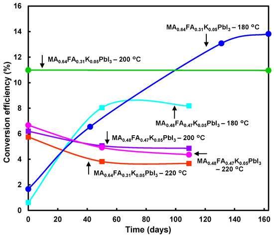 Figure 3 shows conversion efficiency changes of the perovskite photovoltaic devices. For the as-prepared devices, those annealed at 200 °C showed the highest conversion efficiencies and were almost identical to the conversion efficiencies after 163 days. Conversely, the conversion efficiency of the MA0.48FA0.47K0.05PbI3 device, prepared at 180 °C, improved from 0.613% to 8.18% after 109 days, as shown in Figure 3. For the devices annealed at 220 °C, the conversion efficiencies decreased after 50 days.