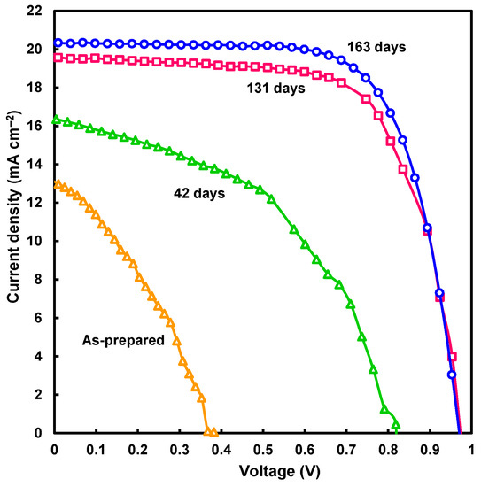 Changes to the J-V characteristics of the MA0.64FA0.31K0.05PbI3 device, prepared at 180 °C, are shown in Figure 4. For the as-prepared device, the highest conversion efficiency was observed at 1.67%, as shown in Table 1. After 42 days, VOC and JSC were improved. Furthermore, FF also improved after 131 days. After 163 days, the photovoltaic properties of the MA0.64FA0.31K0.05PbI3 device were further enhanced, and the highest conversion efficiency of 13.82%, a VOC of 0.970 V, a JSC of 20.3 mA cm−2, and a FF of 0.700 were obtained, as shown in Figure 3 and Table 1.