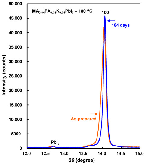 Microstructural changes of the MA0.64FA0.31K0.05PbI3 device annealed at 180 °C were investigated by XRD, as shown in Figure 5. Small PbI2 peaks were observed in both XRD patterns, and further PbI2 formation was suppressed, even after six months. Full-width at half maximum (FWHM) for the MA0.64FA0.31K0.05PbI3 device was reduced after six months, which indicated the crystallite size of the perovskite increased, as shown in Table 2. The XRD observations indicated the crystal growth of the perovskite compound, which led to a decrease in the grain boundary area and point defects and, hence, improvement in the photovoltaic performance. The lattice constant of the perovskite compound was observed to decrease slightly, as shown in Table 2, which relates to the desorption of a small amount of MA.