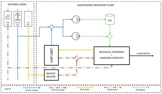 The biological secondary treatment in WWTPs typically involves activated sludge (AS) technology, which is the most widely applied treatment worldwide to remove biodegradable carbon, suspended solids (SS) and nutrients from wastewater []. The available process models of the biological phase include the activated sludge model number 1 (ASM1), developed by International Water Association (IWA), which describes the biochemical processes within the aerated tank with 8 processes and 13 state variables []. Recent studies demonstrated that modelling diurnal energy prices variation by coupling the ASM1 model with an energy pricing and a power consumption model could enable the WWTP managing utility to reduce plant energy consumption []. However, as noted by some authors, a joint representation of the electricity system behavior and the wastewater treatment process in an integrated energy system has not been implemented at present. Nowadays, mathematical modelling and simulation tools are being increasingly applied to WWTP upgrading and optimization []: multi-objective optimization models, in particular, allow one to account for different objective functions, with the aim of optimizing design and operations of a selected process [].