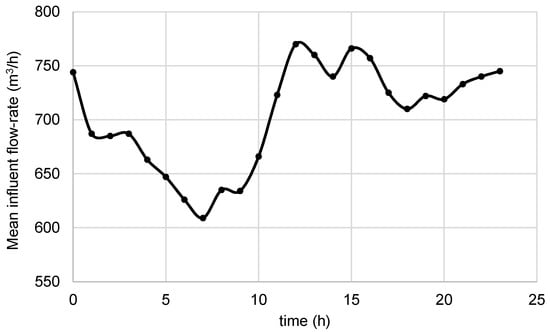 The daily pattern of wastewater flowrate was obtained from one-year hourly data of a medium-scale municipal WWTP (86,400 population equivalent (PE), Udine Province), highlighting two distinct peaks at 1 p.m. and 4 p.m. (Figure 2). The obtained data were consistent with the typical reported 24-h behavior of flowrate in municipal WWTPs [].