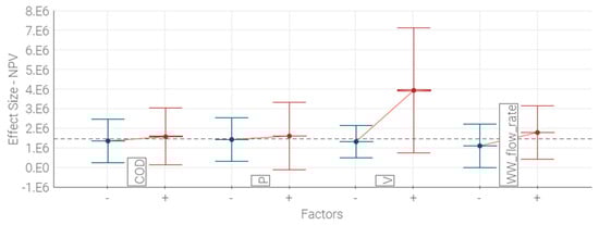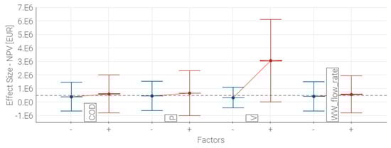 In the second scenario, AD introduction is included, with biogas valorization through the CHP unit, able to supply a share of the needed electricity. The analysis of the influence of single input parameters on NPV value (Figure 5) shows that a similar behavior to that encountered in Scenario 1 (Figure 3) is obtained, even if influent wastewater flowrate has a stronger influence, due to the fact that AD becomes more convenient for a higher plant potentiality.