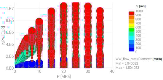 The detailed analysis of NPV variation with respect to air storage pressure, reported in Figure 4, interestingly highlights that NPV increases to a maximum at an intermediate pressure value, while a decrease is observed for a further pressure augmentation (in particular considering larger tank volumes); this is due to the fact that for a higher vessel pressure, the specific compression power increases, leading to higher compression costs.