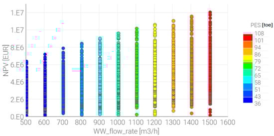 Influence of the treated wastewater flowrate on NPV and PES indices (Scenario 2).