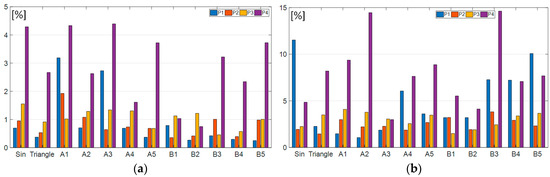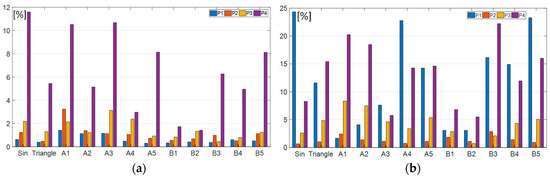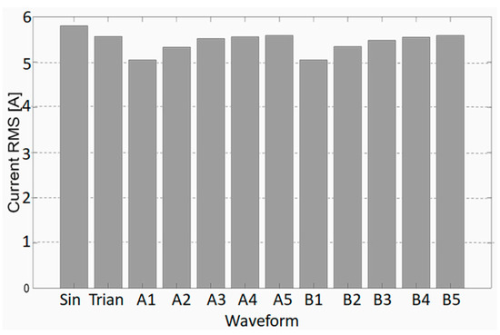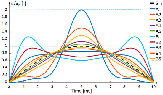 Generally, electricity quality is described by two factors: voltage stability and THD factor. For this reason two groups of examined voltage waveforms were described by identical RMS and THD factors, but different shapes and amplitudes. In total, 12 signal waveforms, including sine and triangle, were tested (Figure 3, Table 3). The signal criteria selection was the assumed incidence rate in the power network in case of presence of non-linear devices. THD and RMS values of the sinusoidal signal were used as reference.