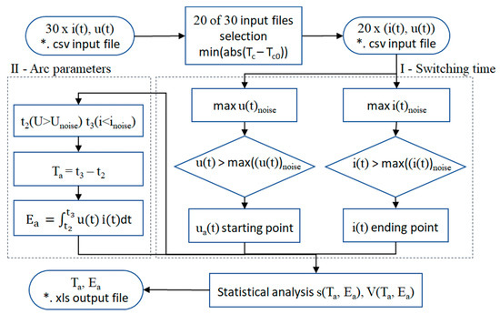 The Matlab script used as input data *.csv text files obtained from oscilloscope readings that contained recorded voltage and current waveforms in numerical form. The output files had the form of *.xls files and held arc energy—Ea, arcing time—Ta, standard deviation (SD) values and the coefficient of variation (CV) values as calculated for each of the calculated quantities of the recorded measurement for each case. Figure 5 presents a diagram of the developed Matlab script.