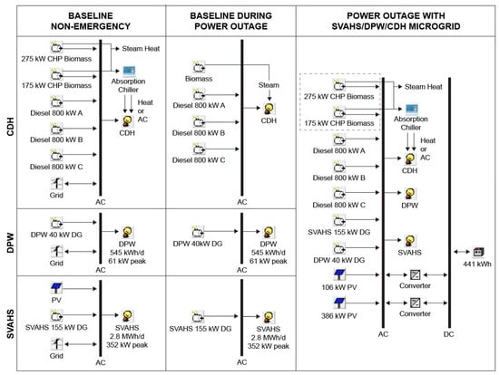Figure 2 presents the aforementioned power components as currently configured at all three facilities when operating under either normal or emergency conditions. The enhanced microgrid as it would operate during power outages is presented in the far-right box. Note that the biomass facilities were excluded from the resiliency analysis because they would trip off during voltage sags and would therefore be unsuitable for providing power when operated in islanded mode.