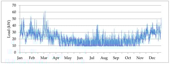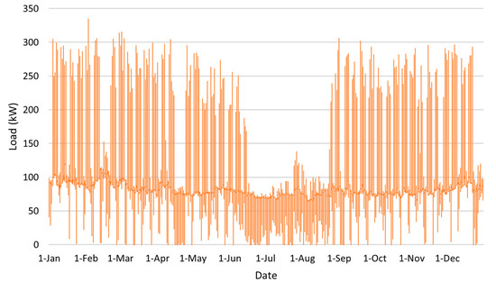 The CDH and SVAHS each have historical interval electricity data available from the utility to assist with understanding electric loads, variation, and sizing of the microgrid system (Figure 3 and Figure 4). However, the Northampton DPW facility did not have a record of electrical load at such intervals, and only monthly billing totals were available. Therefore, the Facility Energy Decision System (FEDS—PNNL, Richland, WA, USA) software was used to derive representative load profiles for the DPW buildings.