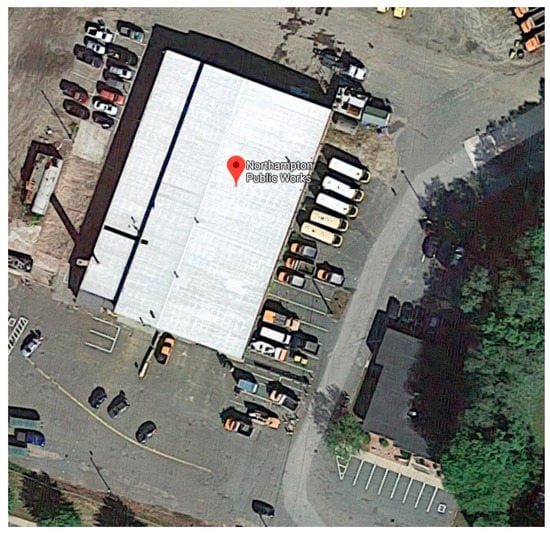 There are two buildings at the Northampton DPW site: a small administration building and a garage. These are shown in the satellite image in Figure 5. The administration building is 3868 ft2 and was built in 1973. The 20,700 ft2 garage is an old trolley barn built around the start of the 20th century, and provides vehicle bays, shops, and some limited office space. Without the ability to perform an on-site walk-through, available data on occupancy, HVAC, and hot water systems were provided by City of Northampton staff, along with the result of recent assessments that included information on envelope characteristics, lighting types, and counts. Google Earth satellite and street view imagery (Apache Software Foundation, Wakefield, MA, USA) was used to help validate select data, and fill in gaps regarding modeling geometries, construction characteristics, window fraction, and more. Energy billing data was also provided by the city, including monthly electricity and natural gas consumption for recent years.