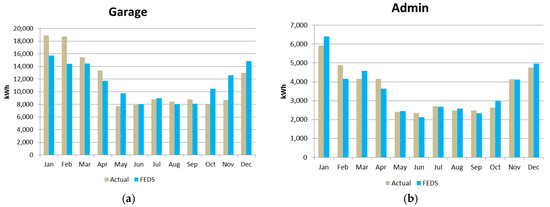 Results of FEDS simulated model calibration show monthly electricity consumption vs. actuals for the DPW garage (a) and administrative building (b).