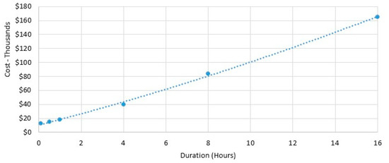 In order to assign monetary values to reducing or eliminating potential outages, the findings of [20] from Lawrence Berkeley National Laboratory were used. This process estimates costs based on customer group (residential, small commercial and industrial (<50,000 annual kWh load) and medium/large commercial and industrial) and the duration of the outage. Figure 9 presents an example of the trendline used to estimate the cost for different lengths of outage for medium/large commercial and industrial customers.