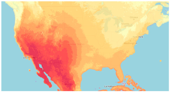 To evaluate the potential energy production from solar PV panels in Northampton, a number of solar profiles were used with an established solar PV production model. The solar data was gathered from the National Solar Radiation Database (NSRDB)—specifically, the Physical Solar Model (PSM) dataset. This dataset provides both a large temporal coverage over 20 years of data, as well as relatively fine spatial resolution (4 × 4 km) for all locations in the continental U.S. (Figure 10). The data used in this evaluation is hourly (though 30-min data is also available) [21].