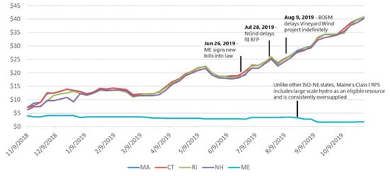 - “New England Class I REC Market Update”. Power Advisory LLC. Available online: https://poweradvisoryllc.com/new-england-class-i-rec-market-update/ (accessed on 11 May 2020).