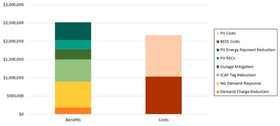 - Over a 20-year life, the BESS and the 386 kW solar array are estimated to generate $2.5 million in present value benefits. This value exceeds the $2.2 million in present value costs necessary to install, maintain, and operate the assets. The overall ROI ratio for the project under this scenario is 1.16.