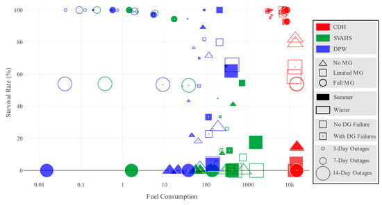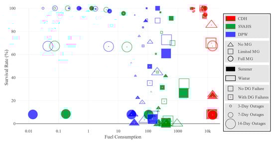 Compared to results with PV arrays at CDH included, worse survival rates across the board are observed. The energy that would have been generated by PV arrays will have to be generated by DGs instead. The fuel shortage is therefore aggravated. Results are presented in Table 17 and Table 18.