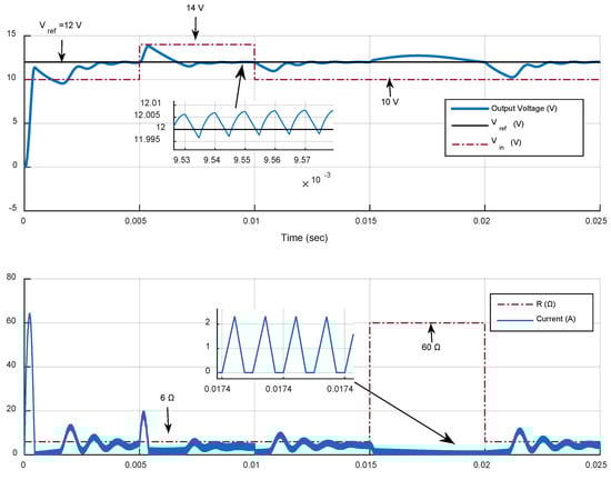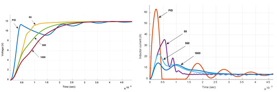 Figure 3 and Figure 4 reveal the performance improvements resulting from the addition of the MPC RG to a primal PID type-III controller in four different cases, i.e., (a) a startup transient in boost mode and light load conditions (R = 6 Ω), (b) line voltage step changes from 10 to 14 V (boost to buck) or 14 to 10 V (buck to boost), and (c) large load perturbations (from R = 6 Ω to R = 60 Ω) in boost mode. It is clear from all four different tests that the PID type-III controller alone suffers from long settling times due to highly oscillatory behavior, giving also rise to large current spikes in the initial phase of the transients and prolonged current saturation in many cases. It is also evident that the MPC RG scheme provides significant improvements in terms of rise time, settling time, and overcurrent avoidance. Further details can be found in Reference [22]. Similar conjectures are made in other publications with buck or boost converters and RG schemes [21,22,23,24,25].