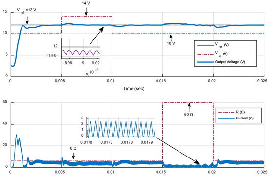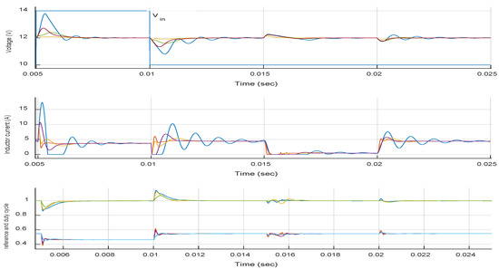 Transient responses of the estimator’s convergence properties for the controller in Figure 6. The combination of PID Type III controller and MPC reference governor is evaluated for constant Vin, R, and varying CPL load in boost mode, for ratios up to 4 (96 W).
