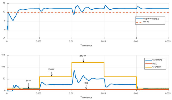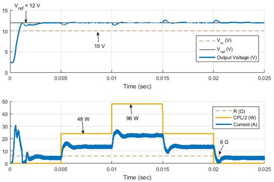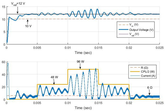 Transient responses of the hybrid controller (PID Type III + MPC RG) for constant Vin = 10 V, R = 6 Ω, and varying CPL load in boost mode. The converter’s robustness limits are investigated with ratios Pr up to 10 (240 W).