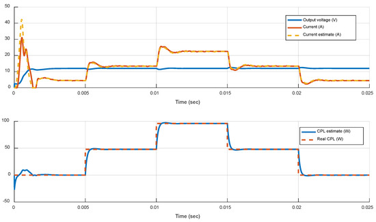 The implementation of the MPC scheme introduced in the previous section requires knowledge of all 5 state variables in , which include the inductor current . To avoid the addition of an extra current sensor, an efficient current observer can be a good alternative. In Reference [21,22], the robust and efficient nonlinear current observer of Reference [31] has been used with very good results, due to its specialized nonlinear structure, as well as the high sampling frequency used. However, this observer is developed for an uncertain resistive load, where its convergence is ensured for known and predetermined bounded variations of the resistance R. In the presence of CPLs, especially if the ratio between the CPL and CVL load is non-negligible, the knowledge of the CPL load is necessary for its proper operation.