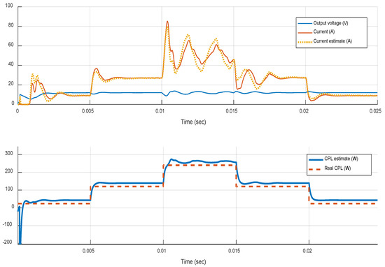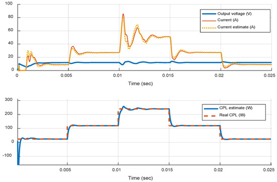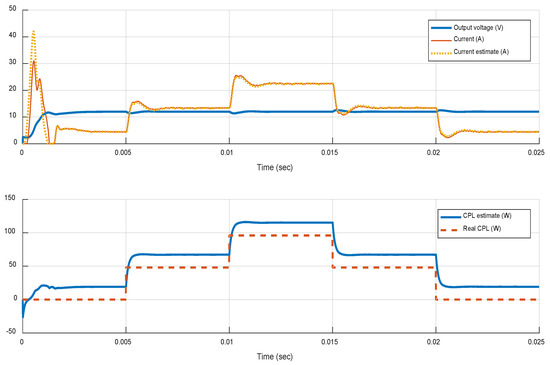Transient responses of the estimator’s convergence properties for the controller in Figure 7. The combination of PID Type III controller and MPC reference governor is evaluated for constant Vin, R, and varying CPL load in boost mode. The converter’s robustness limits are investigated with ratios Pr up to 10 (240 W).