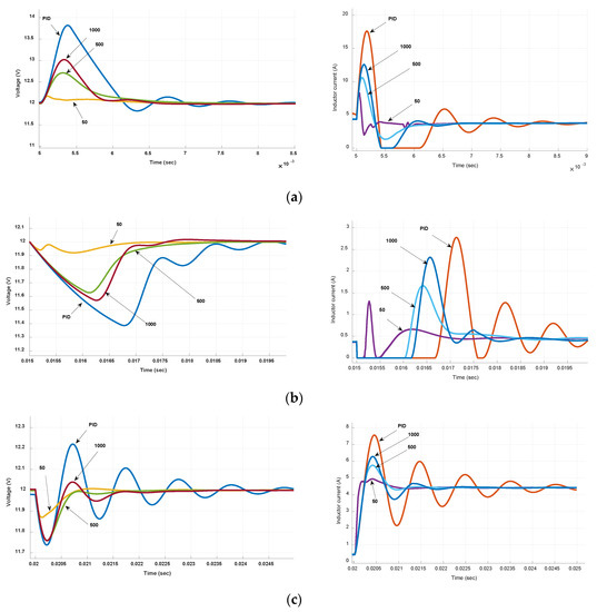 Comparative transient responses (detailed view) for three of the cases of Figure 12. (a) Input voltage step change from Vin = 10 V to 14 V (Boost to Buck mode) for R = 6 Ω; (b) Input voltage step change from Vin = 14 V to 10 V (Buck to Boost mode) for R = 60 Ω; (c) Load step change (from 60 Ω to 6 Ω) in Boost mode (Vin = 10 V).