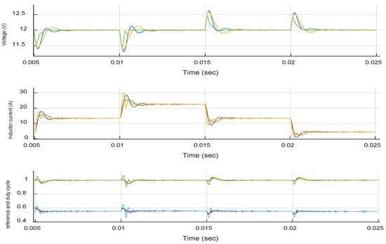 It is worth noting that our custom Matlab code implements a cycle-by-cycle computation with a sufficiently small step length followed by a postprocessing of data to include the diode behavior, along which any computed negative values of current are replaced by zero and the initial conditions for the next cycle are reset. This special piece of code is necessary to ensure correct simulation in cases of saturation (zero inductor current). Although the converter is designed to operate in CCM (Continuous Conduction Mode), in some (mostly extreme) simulation regimes the inductor current reaches zero, a situation that requires special consideration. This is most notably visible in some parts of Figure 3 and Figure 4, where the converter’s operation is heavily stress tested. In Figure 3, Figure 4, Figure 5, Figure 6 and Figure 7, shown before in Section 3, the exact switching rippled waveforms are explicitly shown. For improving the visibility of the presentation and facilitate the comparison, in all following figures, which contain comparative results, only sampled waveforms are shown. The sampling frequency is equal to the switching frequency (Table 3) (Another simpler and much faster, albeit approximate, Matlab implementation has been tested that uses a discretized nonlinear averaging model. For such a high sampling frequency, the results obtained are very close to both exact methods mentioned above, provided that no current saturation occurs and the system is operating in CCM mode).