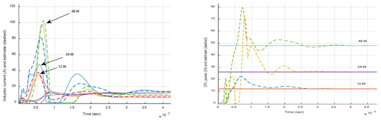 Relative to the Section 3 results shown in Figure 6 and Figure 7 for the hybrid controller (Type-III + MPC RG), Figure 8 and Figure 9 present the hybrid estimator’s transient properties. The top sub-figures show the convergence profile of the current estimator (18), while the bottom sub-figures reveal the transient behavior of the power estimator (20). Accurate and fast convergence in all cases is observed. This is the key to the successful output voltage regulation of the hybrid controller shown in Figure 6 and Figure 7.