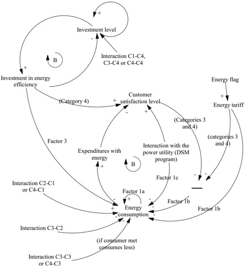 Finally, in addition to Reference [9], we present a causal loop diagram (CLD) of the ECM. As can be seen in Figure 1, the main variable and focus of the analysis in the model is energy consumption. Starting from the upper left corner, a balancing loop on the investment in energy efficiency is presented. The variable “Interaction C1-C4” shows that a consumer in Category 1 is affected by a consumer in Category 4. The same logic is applied to C3-C4 and C4-C4 and all other variables related to customer interactions on the diagram. When these interactions take place, they increase the investment level of the affected agents. A higher investment level increases the probability of investments in energy efficiency taking place, and the event of investments in energy efficiency, in turn, decreases the investment level, reducing the likelihood that such an event would happen again soon. The investment level can also change for every iteration, according to the customer satisfaction level. Finally, investment in energy efficiency directly decreases energy consumption, but also increases customer satisfaction levels for consumers in Category 4.