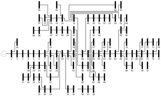 The case study presented in this paper uses feeder data adapted from a real feeder of a Brazilian distribution company, as previously described in References [29] and [30]. While feeder data were processed to obtain a suitable scenario for the system tests, they represented conditions consistent with Brazilian distributions grids: Several customers connected to the same transformer. The feeder is purely radial, overhead, and urban and uses a medium voltage level of 13 kV. It has no distributed generation sources, voltage regulators, or capacitor banks. The values of resistance and reactance of each section of the feeder are presented in the Appendix C of Reference [29]. The feeder had 99 buses, one of generation (substation), and remaining load buses (distribution transformers). In this work, only the 78 transformers, where 7299 low-voltage customers were connected, were considered. The remaining buses were either assigned to street lighting or medium voltage commercial customers and were not considered with the purpose of avoiding distortions and allowed us to focus exclusively on the emergent properties of the energy consumption on residential feeders according to the ECM. Figure 2 presents the single line diagram of the distribution feeder. Its current limit is 325.3 A on bus 1.