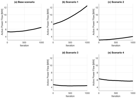 Scenarios 3 (Figure 3d) and 4 (Figure 3e) showed an initial decrease in the power flow levels. In scenario 3, an initial drop could be perceived in the first 300 iterations. After that, the levels remained relatively constant, even increasing slightly. We found a steeper decline in scenario 4. One of the most important reasons for that is the number of investments made by consumers in category 4.
