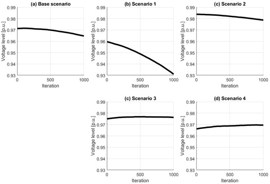 The minimum voltage value throughout the feeder for each evaluated iteration in a per-unit scale (the nominal base voltage of the feeder is 13 kV) is presented in Figure 4. If we consider a voltage limit of 0.95 p.u., it would have trespassed only in scenario 1 (in the last iteration, 68.7% of the buses).