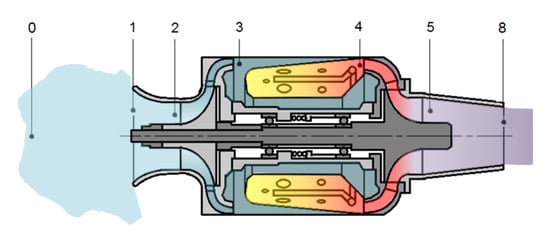 Turbojet engines, even if their utilization has reduced in commercial aviation during the past decades due to their comparably less propulsive efficiency [4], still have a role in different propulsion systems. There is an increasing interest in Unmanned Aerial Vehicles (UAV’s) in the past decade [5], which has led to a considerable interest in developing micro turbojet engines, as stated in [6,7] or [8], because these engines can be applied on military UAV’s, which can include high-speed aircraft (as shown in [9]), where the turbojet already provides fair propulsive efficiency. Meanwhile, there is an ever-increasing interest in radio-controlled model airplanes that imitate real aircraft in civil sector as already reported by [10], and these devices are becoming more attractive [11]. Micro turbojet engines can act as auxiliary power plant of sailplanes, one can find really early initiatives like [12] as well as recent studies presented e.g., [13]. Although the non-optimal speed range of sailplanes turbojets can still be an alternative to piston engines, because they feature relatively simple structure along with reduced weight which is a benefit for small units, as it was stated by [14]. On the other hand, as the aero-thermodynamic processes are similar to large scale engines possibly with bypass, micro turbojet engines can be utilized in research and education as well, as reported by several authors such as [15,16] or [17]. According to [18], results obtained on turbojet engine can be used to draw conclusions about non-propulsion power development units, which further enhances the role of turbojets in research applications. In several cases turbojets form the basis of a different development version like turboprop, as found in [19]. Variable nozzles are already being under investigation for turbofan engines as mentioned in [20], which system can also be assessed on turbojet engines ([21] or [22]).