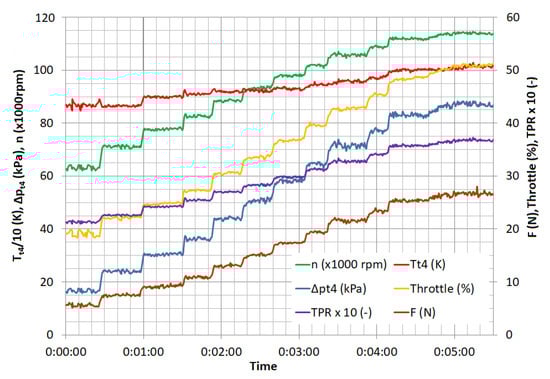 The measurement for identification was performed between idle and nominal, the main engine parameters are indicated in Figure 2, where the chart starts from the stabilized idle condition, and it shows state variables, command input in percentage, thrust and TPR as well. The latter is scaled by a factor of ten, rotor speed is indicated in thousands of rpm, is divided by ten, and finally is the gauge pressure at turbine inlet above atmospheric one. The measurement was carried out in multiple steps, thus the engine can sufficiently be stabilized in each different operating mode.