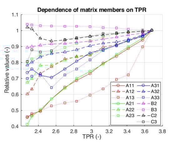 The different matrix members naturally change throughout the operational envelope of the micro turbojet engine. These changes are covered by an interpolation between individual discrete point values identified via measurement. This method has been based on the description offered by [47]. The different members are indicated in Figure 3, where red lines represent the rotor speed derivatives, green lines stand for the turbine inlet total pressure derivatives, and the turbine inlet total temperature derivatives are shown with blue lines. The input matrix members are magenta, and output matrix parts are drawn with black. The piecewise linear interpolation was practical selection because several parameters show significant variation between neighboring points.