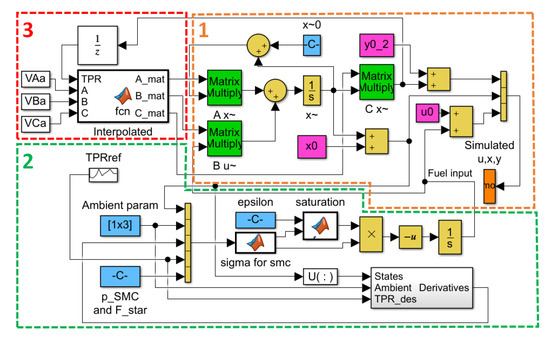 The second main block encircled by green borders represents the controller and its related functions. The main part of SMC is found in the center of this block, labeled as “sigma for SMC”. This is a MATLAB function, i.e., it contains the conventionally written program that performs the necessary calculation. On the left side of this entity, one can see a tall vector concatenation, which introduces system states, ambient parameters, derivatives, reference and coefficients p and to the main block. The reference TPR block contains a sequence which corresponds to another measurement, in order to make it sure the model can be validated against real operational data. The second MATLAB function in this area is labeled “saturation”, this ensures that the chattering can be eliminated by defining a small, positive value , which is found just left of the parent block in a blue rectangle. The saturation block receives from sigma calculation, the second output is , which is multiplied with the output of saturation block, then negation and integration take place. One important input group for the sigma calculation are the derivatives of different variables. The sub-model in the right bottom corner includes discrete time derivation for states, ambient and TPR demand. Values with higher noise components also include discrete-time low-pass filter. These values are then sent to the vector concatenate at the entry of sigma block.
