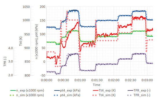 The primary parameters including state variables and TPR are indicated in Figure 5 which shows both measured and simulated values. The formers are indicated by dark solid lines, meanwhile, the latter are shown with lighter dotted series. According to the time series, the majority of the simulated parameters follow the measured data correctly, i.e., the identification can be accepted with the full operating range. There is only one variable, , which has lower accuracy, but it is also slightly exaggerated due to the different scale in use. On the other hand, there are multiple explanations for the inability of this parameter to match the corresponding measurement. The error is considered to be introduced by the measurement itself, as the engine has only six evaporation tubes for the fuel injection due to its small size. Therefore, the temperature field is somewhat heterogeneous at turbine inlet and outlet as well. In order to reduce the influence of measurement equipment toward the flow itself, there was only one thermocouple installed to measure the outlet temperature and a calculation based on other thermodynamic parameters yielded the turbine inlet temperature . The calculation and derived errors have surely contributed to the increased error levels. In different operating conditions one can see both positive and negative overshoots, however, the trend of the parameter follows the awaited values correctly. As a second founding, one can state that simulation always introduces peaks at the beginning of transient processes. This can be explained as the gas turbine first receives changing fuel injection, then it can react according to the dynamics of the system, that is, the rotor speed can change, which in turn affects the air mass flow rate and the temperature can finally decay.