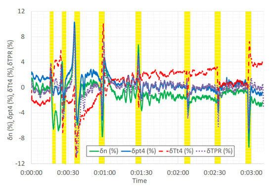 The second reason for the peaks in relative errors is that there is a difference between real fuel supply dynamics and simulation. In the real system the fuel mass flow rate is influenced by the rotating speed of the fuel supply pump. Therefore, it inherently will have a delay due to rotor dynamics. On the contrary, in the simulation, the authors have chosen a simpler way, as the transients themselves were not the most important parts of this investigation, namely, the fuel supply was changed in abrupt steps. Therefore, these peaks, which arise from the different nature of measurement and simulation, are not considered further and are highlighted in Figure 6 with yellow background.