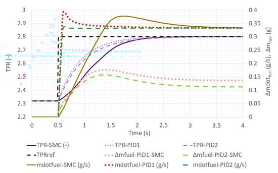 The difference in consumed fuel amount is also shown in Figure 8, which corresponds to the excess fuel supplied during this transient, in contrast to the amount which is being consumed during the initial steady state operating mode. There are evidently two curves that belong to this concept, with a reference to the SMC, thus the two differently tuned PID systems are compared. Both PID controllers have a final difference slightly over 0.1 g, which is considerably high, if one takes into account, that the initial steady state mode has 0.777 g consumption every second. Throughout the entire four seconds taken into account by this investigation, the total consumed fuel amount can be seen in Table 6. As it can be seen evidently, the difference between SMC and PID corresponds to at least two percent, and in each cases the SMC control offers favorable consumption.