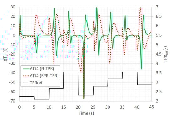Controllers for rotor speed and TPR had same p and values, the single difference was in handling the , for rotating speed, due to the much higher magnitude of this parameter, it was set to 2500, instead of the original 0.1 for the TPR. Due to much smaller range of EPR changes, the values of = 1.5, and = 0.4 have been selected. These values were determined using a trial and error procedure.