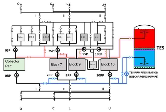 Figure 1 shows a simplified layout of CHP plant Siekierki. The CHP plant is connected to the DHS. The main piping lines indicated in the Figure 1 as O, C, L, and U are responsible for supplying hot water to the DHS (top of the figure) and collecting cold water coming back (return) from DHS (bottom of the figure). The pumps responsible for return water are indicated as RP, pumps supplying water to the DHS are indicated as SP, water boilers B, and network water heaters XB or XC.