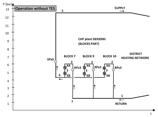 The pressures diagram for the Blocks Part of the CHP plant Siekierki during operation of the plant without TES is shown in Figure 3. The thermodynamic parameters of water at five points of the system for block numbers 7, 9, and 10 were calculated on the basis of collected operational data of CHP plant (1—before RP pumps, 2—after RP pumps and before XA heat exchanger, 3—after XA and before XB heat exchangers, 4—after XB heat exchanger and before SP pumps, 5—after SP pumps).