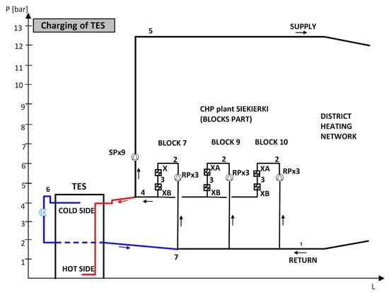 Figure 4 shows a pressures diagram for the Blocks Part of CHP plant Siekierki during operation of the plant with TES in the course of the charging process of the TES. The thermodynamic parameters of the water at seven points of the system for block numbers 7, 9, and 10 were calculated on the basis of operational data of the CHP plant collected during the charging process of the TES (1—before RP pumps, 2—after RP pumps and before XA heat exchanger, 3—after XA and before XB heat exchangers, 4—after XB heat exchanger and before SP pumps, 5—after SP pumps, 6—cold side of TES before control valve, 7—cold side of TES after control valve).