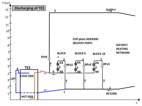 Figure 5 shows the pressures diagram for the Blocks Part of CHP plant Siekierki during operation of the plant with TES in the course of the discharging process of the TES. The thermodynamic parameters of the water at seven points of the system for block numbers 7, 9, and 10 were calculated on the basis of operational data of the CHP plant collected during the discharging process of the TES (1—before RP pumps, 2—after RP pumps and before XA heat exchanger, 3—after XA and before XB heat exchangers, 4—after XB heat exchanger and before SP pumps, 5—after SP pumps, 6—cold side of TES after DP pump, 7—cold side of TES before DP pump).