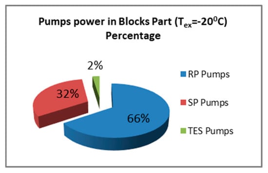 Figure 6 shows the percentage of pumps power for discharging of TES operation variant and outside temperatures Tex = −20 °C alternative. In that case TES pumps power represents only 2% of pumps total power in the Blocks Part of the CHP plant.