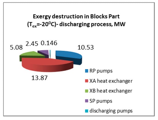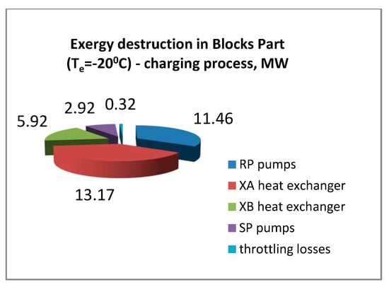 Values of exergy destruction in the Blocks Part of the CHP plant for charging of TES and Tex = −20 °C.